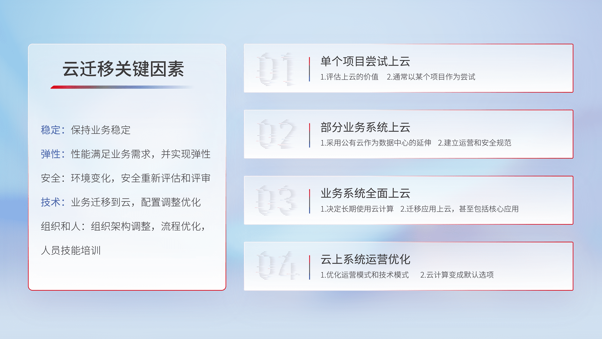 结合实际业务,,,从规划设计、、、云平台选型、、、、云原生改造、、数据迁移、、、、集成交付,,,,迁移全过程为客户识别最佳上云路径,,,,做好风险识别管理,,,,设计网络架构、、、身份权限、、安全审计合规、、、、操作审计、、、日志审计、、、、监控告警策略、、多站点容灾设计等,,对云上基础设施进行整体规划,,,,提升IT治理水平,,以满足弹性、、高可用、、高性能的需求。。。。