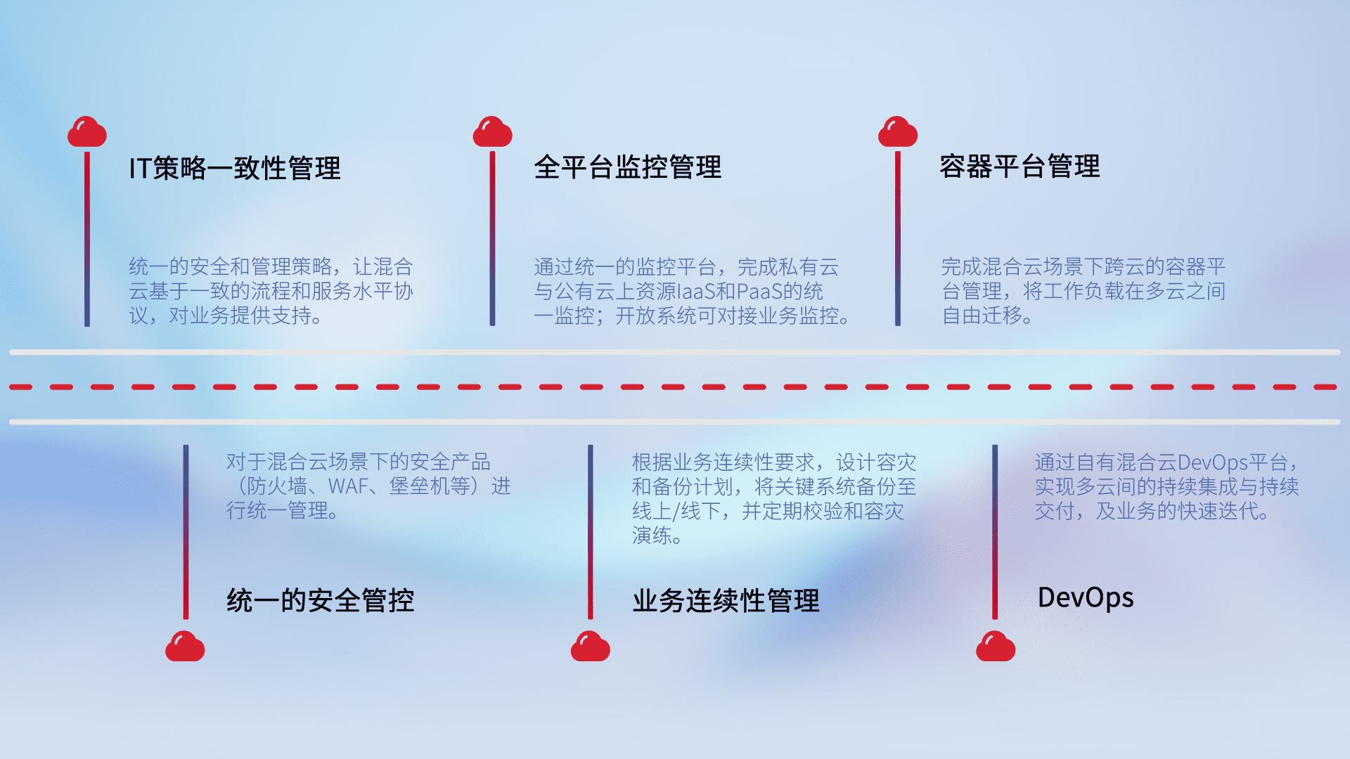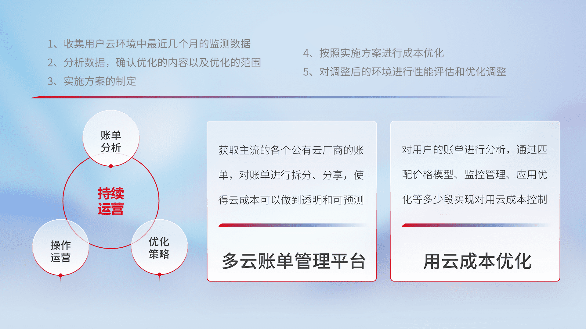 通过多云纳管,,,以统一的资源数据模型把客户的云资源进行抽象和封装,,进而实现对多云资源的统一操作,,,,保障云资源管理的可靠性、、、、稳定性与可用性。。。。量身定制化运维内容,,,,配置、、、开发运维、、、、补丁管理、、备份、、、监控、、、认证和访问管理、、审计和日常巡检等,,保障在用云过程中的可靠度,,,,稳定度以及高可用率。。。