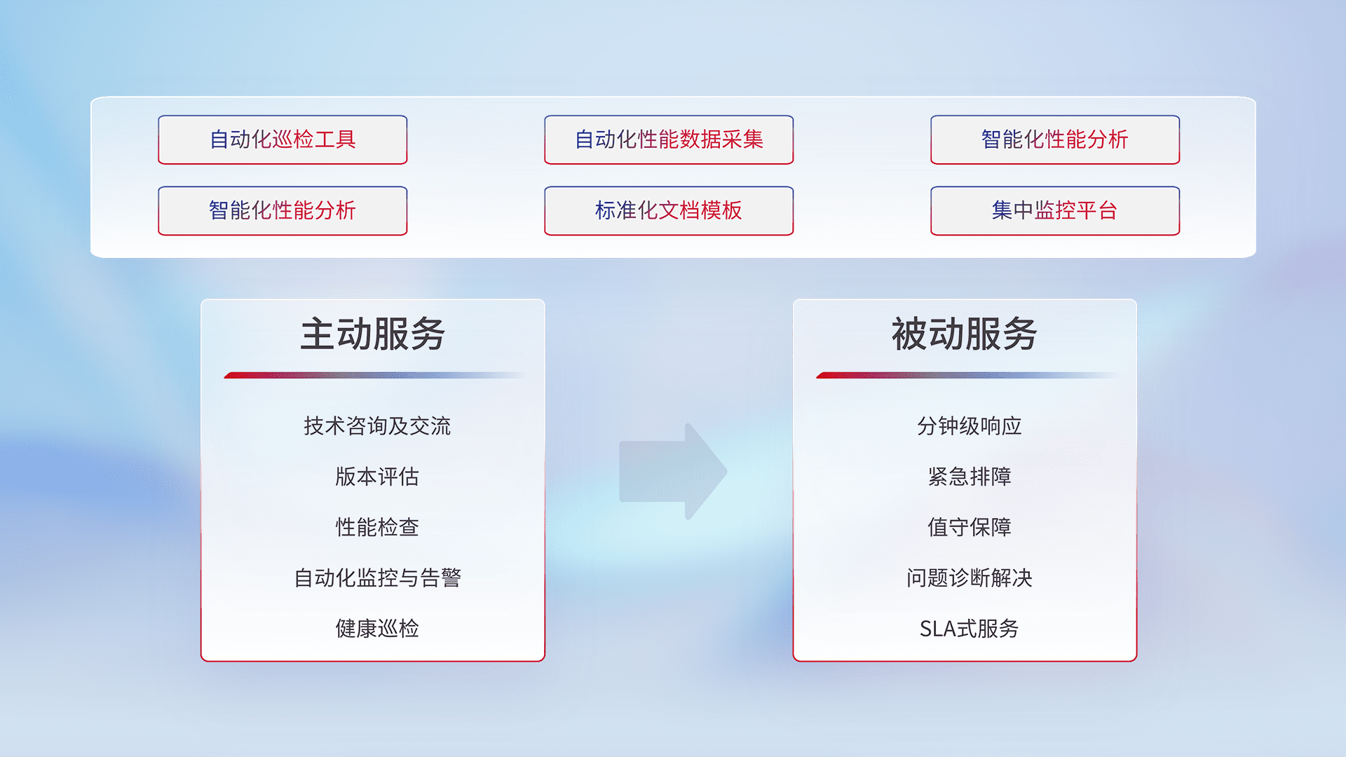 智能化工具和标准化文档,,保障服务质量,,,,提供主动服务(包含技术咨询、、、版本评估、、性能检查、、、、自动化监控与告警、、、健康巡检)和被动服务包含(分钟级响应、、紧急排障、、、值守保障、、问题诊断解决、、、SLA服务)。。。。