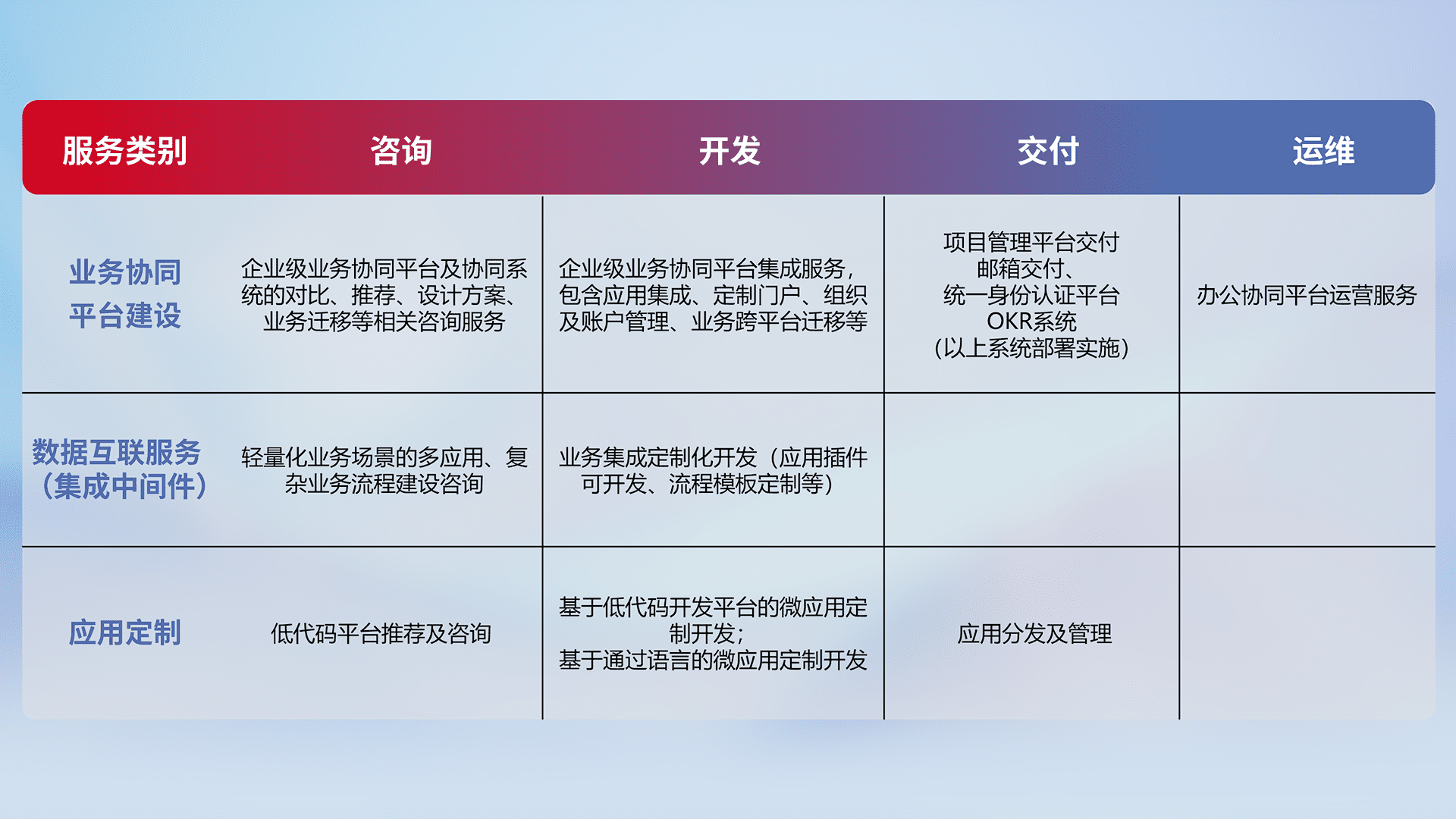 针对钉钉、、、企微、、、IDaas等平台级产品提供产品的规划、、方案、、、交付、、、、定制化开发等服务,,实现如统一协同办公、、智能客户服务、、混合会议管理、、、智能数据查询、、、、等业务场景,,,,实现数字化转型。。。